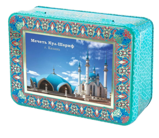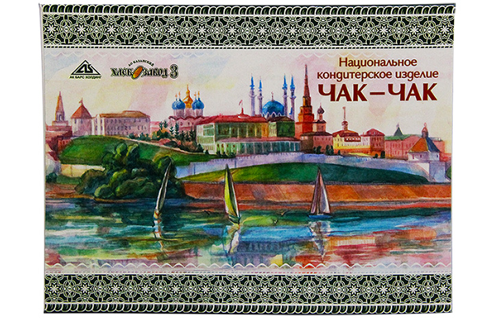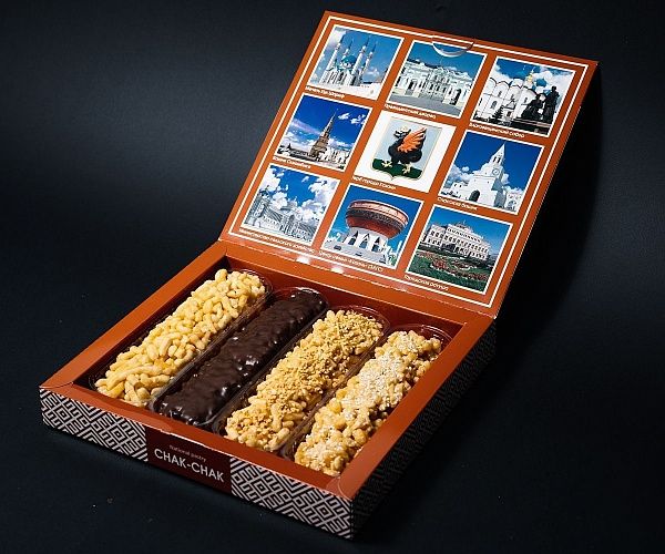 Чак-чак приготовленный по старинным татарским рецептам, в сувенирной коробке, с изображениями достопримечательностей Казани.