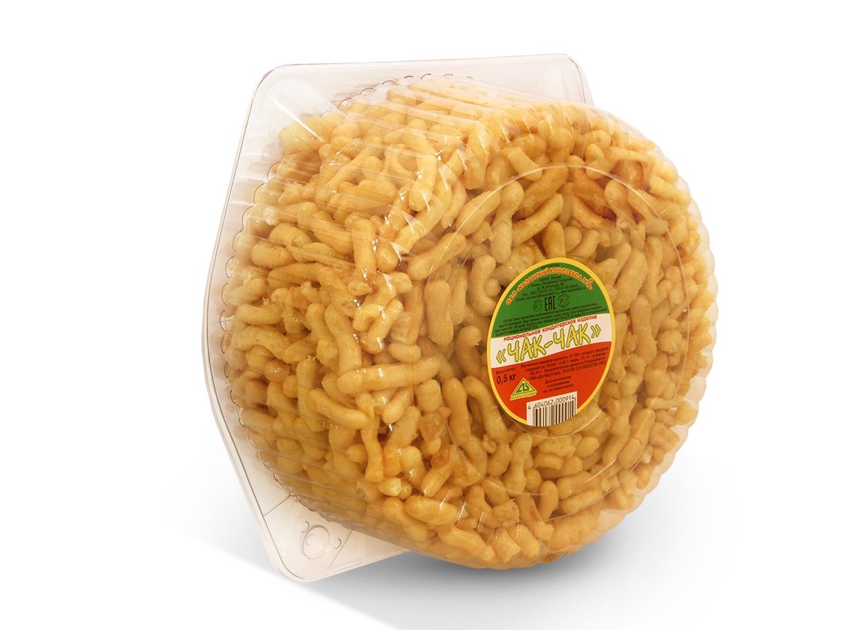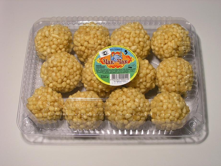 Чак-чак – традиционная восточная сладость тюркских народов, представляющая собой изделие из пресного теста с медом. В Татарстане и у татар принято встречать гостей чак-чаком. Традиционно чак-чак готовят из мягкого теста, из которого формируются тонкие короткие палочки или шарики величиной с орешек, обжариваются на масле, а затем поливаются горячей массой, приготовленной на основе меда.